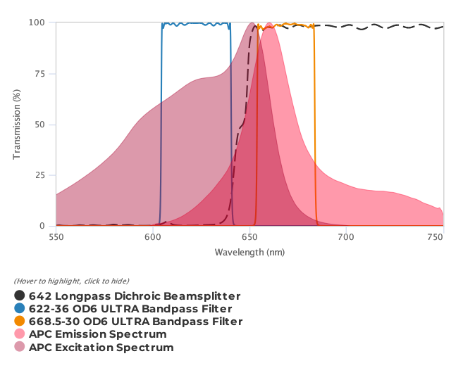 5-CNF, Alexa Fluor® 633, Alexa Fluor® 647, ATTO 635, ATTO 647, ATTO RHO14, BODIPY® 650/665-X, Carboxynapthofluorescein, CellTrace Far Red, CF633, CF640R, CF647, Cy®5, CypHer5 (pH 4.67), DDAO, DiD, DRAQ5, DY-630, DY-631, DY-633, DY-635, DY-636, E2-Crimson, EVOblue-30, FluoSpheres® Crimson, HCS CellMask Deep Red, HCS LipidTOX Deep Red Neutral Lipid Stain, HCS NuclearMask Deep Red, HiLyte Fluor 647, HiLyte Plus 647, LIVE/DEAD® Fixable Far Red Dead Cell Stain, MitoTracker® Deep Red, Nile Blue (EtOH), Nile Blue (MeOH), NIR4, NirFP, Oxazine 1, PromoFluor-633, PromoFluor-647, Spectrum Far Red, Squarylium Dye III, SYTO® 61, SYTOX® Red, TO-PRO®-3, TOTO®-3, Vybrant® DyeCycle Ruby |