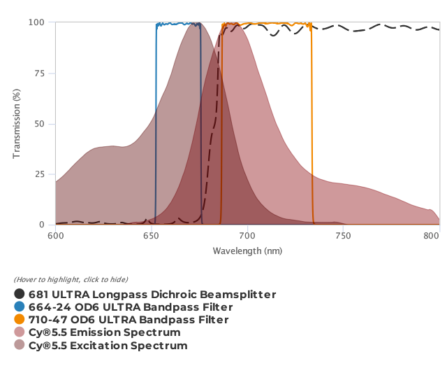 ULTRA Series Cy®5.5 fluorescence filter set designed to provide bright, high-contrast images of Cy®5.5-stained samples when illuminated with an LED light source. This filter set is also ideal for use with Alexa Fluor® 680 and all other similar fluorophores. ULTRA Series filter sets provide better overall performance than our standard filter sets by using a combination of tight wavelength control (typically ± 1.5 nm), ultra-steep edges, deeper blocking, and the industry’s highest transmission levels. They are also specified to produce zero pixel shift when filters are switched out in order to image multiple fluorophores in a single sample. All Alluxa optical filters are durable and hard-coated using our innovative SIRRUS plasma deposition process.