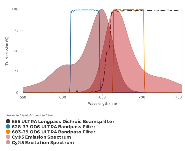 5-CNF, Alexa Fluor® 647, Alexa Fluor® 660, ATTO 635, ATTO 647, ATTO 665, ATTO OXA12, BODIPY® 650/665-X, C5-Thiacyanine, Carboxynapthofluorescein, CellMask Deep Red, CF640R, CF647, CypHer5 (pH 4.67), DiD, DRAQ5, DY-635, DY-636, DY-647, DY-650, DY-651, DY-656, EVOblue-30, FluoSpheres® Dark Red, HCS CellMask Deep Red, HCS NuclearMask Deep Red, HiLyte Fluor 647, HiLyte Plus 647, LIVE/DEAD® Fixable Far Red Dead Cell Stain, MitoTracker® Deep Red, Nile Blue (EtOH), Nile Blue (MeOH), NirFP, Oxazine 1, PromoFluor-647, Quasar® 670, Spectrum Far Red, SYTO® 60, SYTO® 62, Vybrant® DyeCycle Ruby |