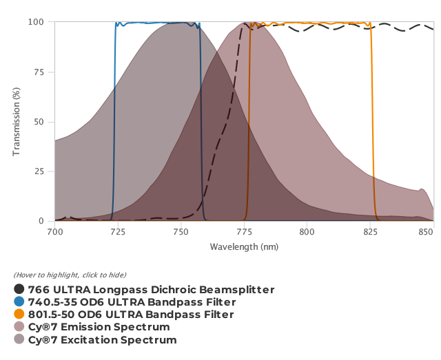 ULTRA Series Cy®7 fluorescence filter set designed to provide bright, high-contrast images of Cy®7-stained samples when illuminated with an LED light source. This filter set is also ideal for use with Alexa Fluor® 750 and all other similar fluorophores. ULTRA Series filter sets provide better overall performance than our standard filter sets by using a combination of tight wavelength control (typically ± 1.5 nm), ultra-steep edges, deeper blocking, and the industry’s highest transmission levels. They are also specified to produce zero pixel shift when filters are switched out in order to image multiple fluorophores in a single sample. All Alluxa optical filters are durable and hard-coated using our innovative SIRRUS plasma deposition process.