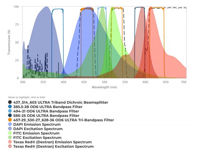 ULTRA Series DAPI, FITC, and Texas Red® multiband pinkel fluorescence filter set designed to provide bright, high-contrast images of samples tagged with multiple fluorophores. This filter set is ideal for use with LED light sources and can be used with Alexa Fluor® 350, Alexa Fluor® 488, Alexa Fluor® 594, and many other fluorophores. ULTRA Series filter sets provide better overall performance than our standard filter sets by using a combination of tight wavelength control (typically ± 1.5 nm), ultra-steep edges, deeper blocking, and the industry’s highest transmission levels. They are also specified to produce zero pixel shift when filters are switched out in order to image multiple fluorophores in a single sample. All Alluxa optical filters are durable and hard-coated using our innovative SIRRUS™ plasma deposition process.