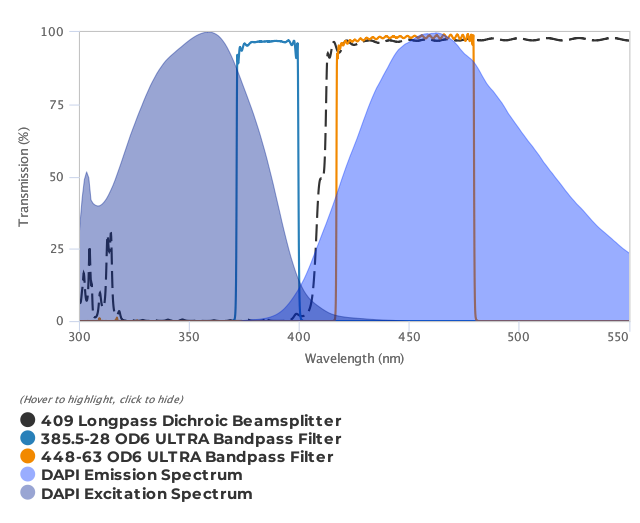 ULTRA Series DAPI fluorescence filter set designed to provide bright, high-contrast images of DAPI-stained samples when illuminated with a 385 nm LED light source. This filter set is also ideal for use with BFP, Alexa Fluor® 405, and all other similar fluorophores. ULTRA Series filter sets provide better overall performance than our standard filter sets by using a combination of tight wavelength control (typically ± 1.5 nm), ultra-steep edges, deeper blocking, and the industry’s highest transmission levels. They are also specified to produce zero pixel shift when filters are switched out in order to image multiple fluorophores in a single sample. All Alluxa optical filters are durable and hard-coated using our innovative SIRRUS plasma deposition process.