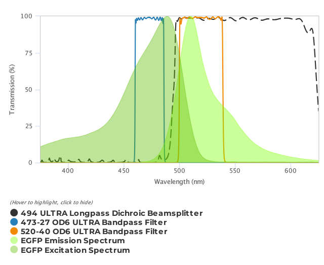 ULTRA Series GFP fluorescence filter set designed to provide bright, high-contrast images of GFP-tagged samples when illuminated with an LED light source. This filter set is also ideal for use with FITC, Cy®2, fluorescein, and all other similar fluorophores. ULTRA Series filter sets provide better overall performance than our standard filter sets by using a combination of tight wavelength control (typically ± 1.5 nm), ultra-steep edges, deeper blocking, and the industry’s highest transmission levels. They are also specified to produce zero pixel shift when filters are switched out in order to image multiple fluorophores in a single sample. All Alluxa optical filters are durable and hard-coated using our innovative SIRRUS™ plasma deposition process.